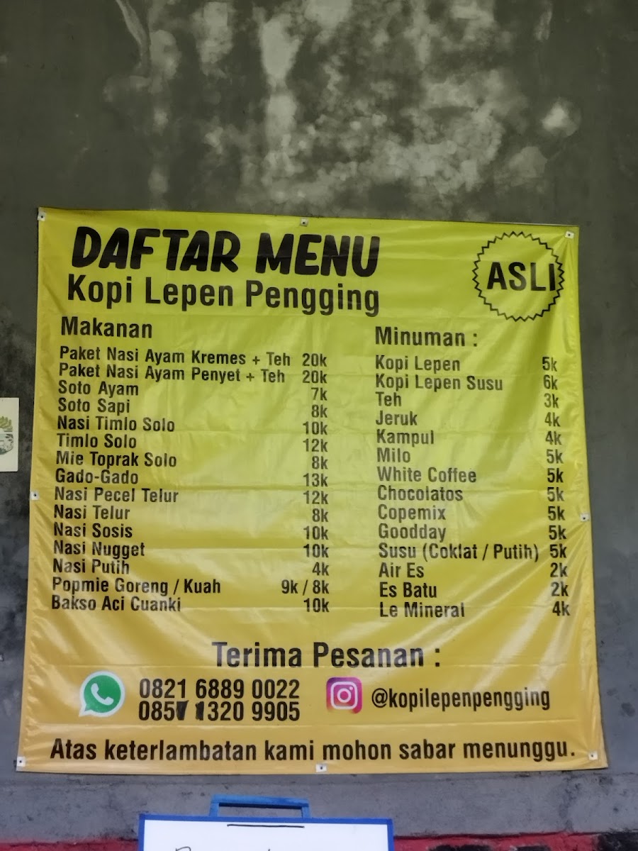 Though sometimes food preparation can take a moment during busy hours, the overall atmosphere and authentic taste make Angkringan Pagi & Kopi Lepen a highly recommended culinary destination in Central Java.